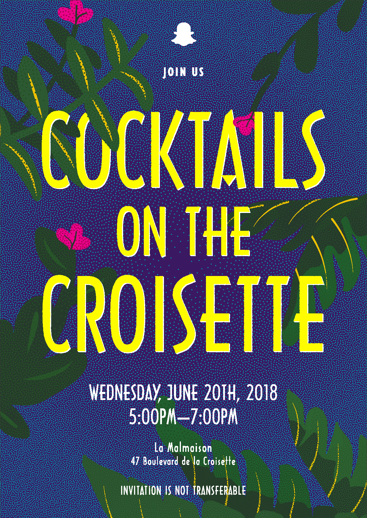 Inspired by the South of France, I illustrated a poster (+5 colorways) for a series of events Snapchat sponsored at Cannes Lions. If you look close enough, there’s a hidden easter egg 💐